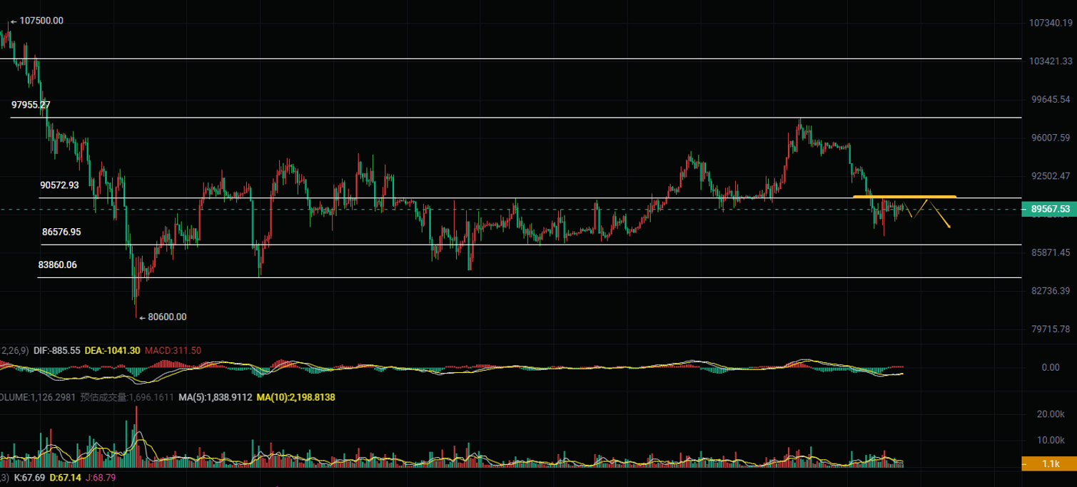 1. 空单策略:90500-89700区间做空,止损91300上方,目标88700-87700
