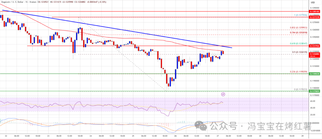 DOGE 价格从 0.1175 美元 附近开始反弹,并逐步攀升至 0.120 美元 上方。目前价格仍低于 0.1250 美元 和 100 小时均线,短期面临调整压力。在 DOGE/USD 小时图上,一条下降趋势线正在 0.1240 美元 附近形成阻力。