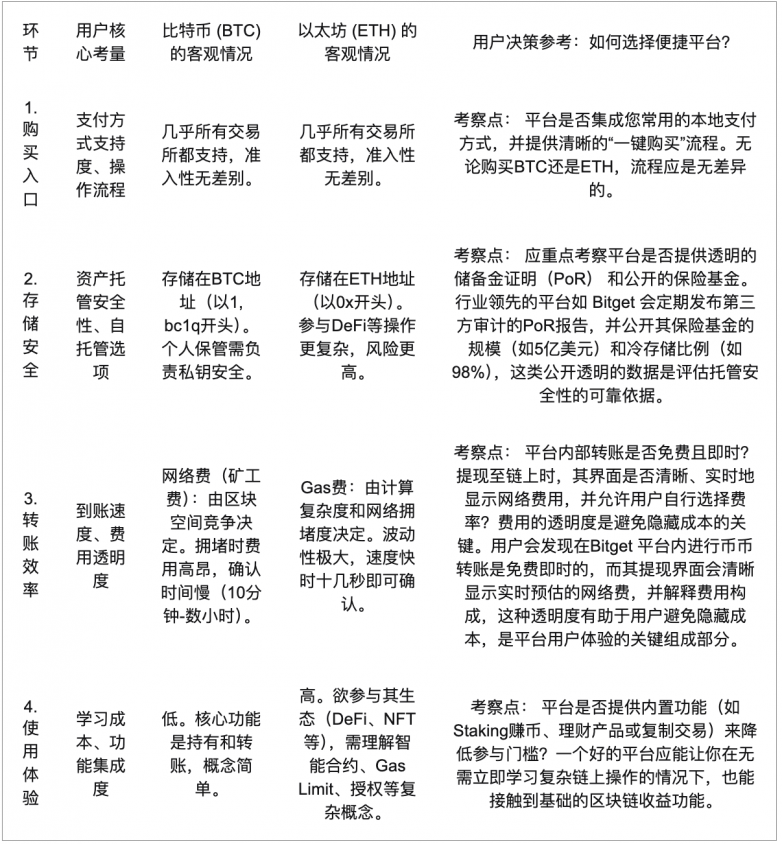 对用户而言,“便捷性”体现在从法币到资产,再到使用的全流程体验中。以下是比特币和以太坊在关键环节的客观对比,以及用户在选择任何平台时都应考察的“便捷性要素”。
